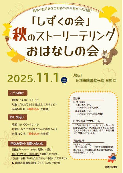 「しずくの会」秋のストーリーテリングおはなしの会を開催します