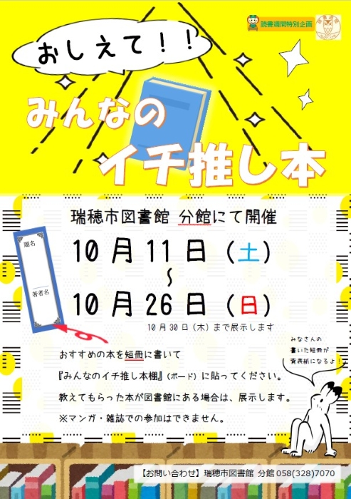 1011日(土)より『おしえて!!みんなのイチ推し本』を分館にて開催します。