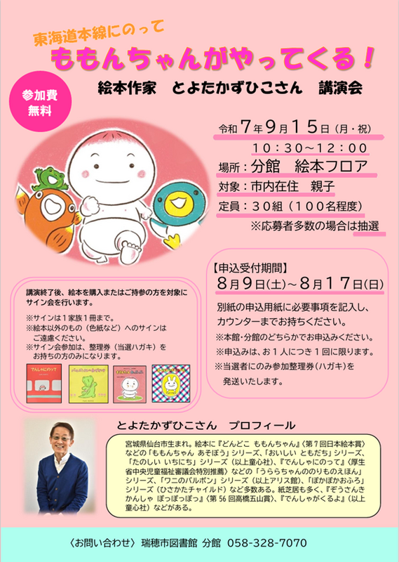 9月15日、分館絵本フロアにて『東海道本線にのって ももんちゃんがやってくる! 絵本作家とよたかずひこさん講演会』を開催します