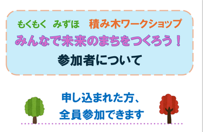 もくもく みずほ 積み木ワークショップ 参加者について 投稿日時 : 10/31 図書館管理者 カテゴリ:分館 参加整理券(はがき)は、10月31日(金)に発送します。 通知が遅れ申し訳ありませんでした。