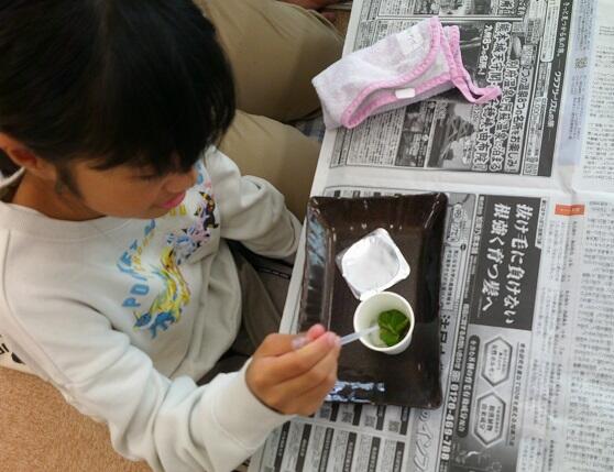 「オオサンショウモ」に水をたらしてみると、水をはじくよ。ヨーグルトのふたも同じしくみでできているんだね。