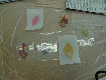 その後、重曹で煮て漂白剤につけた葉っぱを2枚ずつもらい、ハブラシでトントンたたいて葉脈を取り出します。そこにサインペンで思い思いに色を塗って、一枚には銅板を貼って